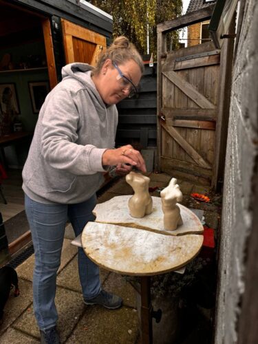 Jacqueline Beukers – Keramiek en Schilderijen. Jacqueline woont in Egmond-Binnen. Als kind was ze al heel creatief met knutselen handwerken spirografie sieraden hout en fantasiepoppen maken. Keramiek is haar grootste hobby geworden het liefste werkt ze elke dag met klei. Ze heeft lessen gevolgd in Gouda Alkmaar Heerhugowaard en Frankrijk met naaktfiguren handvormen en pottenbakken op een draaischijf. Ook maakt ze haar eigen glazuren de mooie kleuren van het glazuren en Raku stoken zijn altijd verassend. Jacqueline maakt onder andere veel dier- en abstracte mensfiguren vazen en urnen. De inspiratie komt tevoorschijn in haar dromen. Meer info over Jacqueline https://jacqiebeukers.exto.nl/ Email: jacqie_beukers@hotmail.com