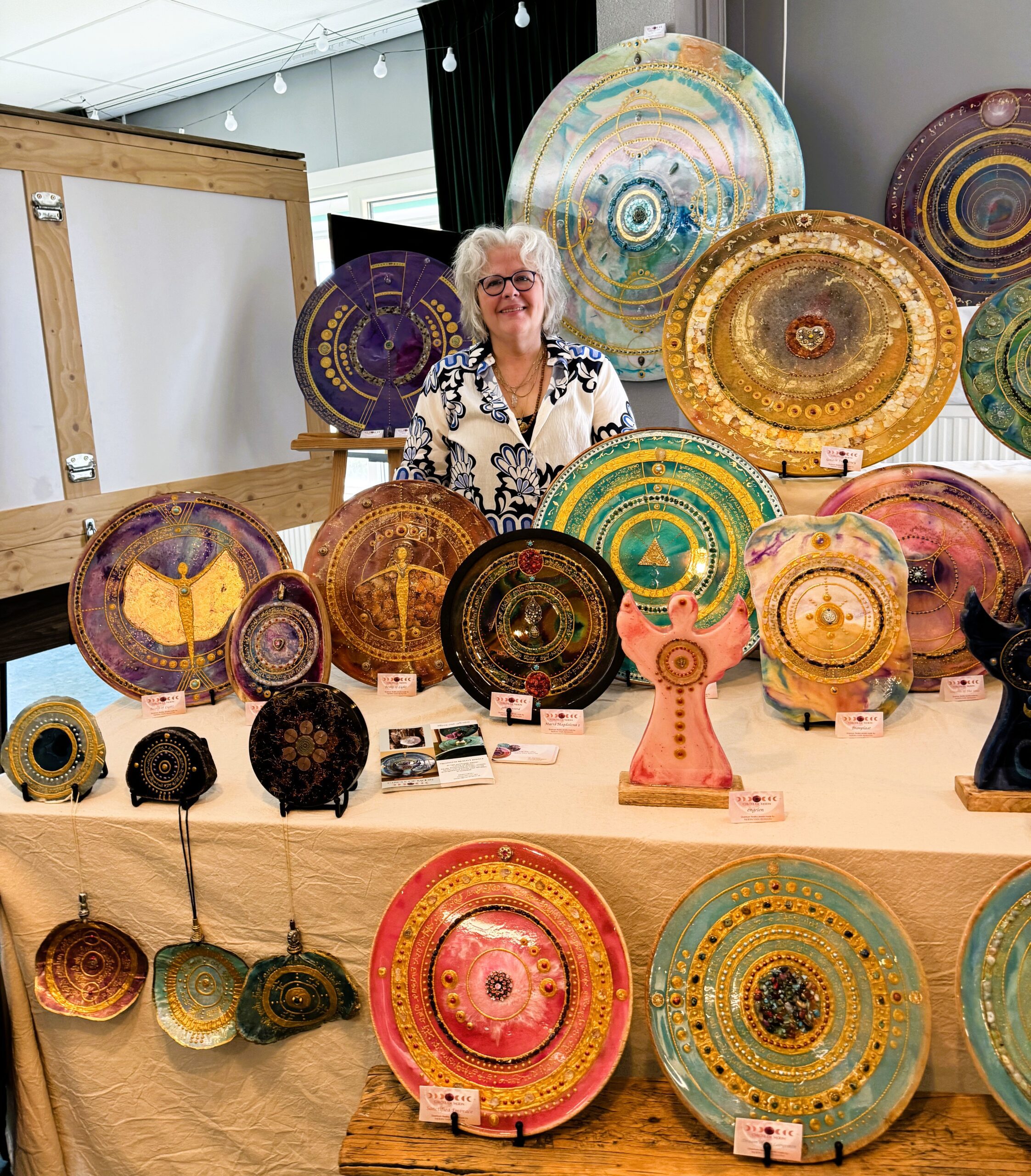 Moon van Avalon Circle of Moon quantum Reality Jewels. In atelier “ Circle of Moon” bij de Schoorlse duinen maakt Moon van Avalon haar Quantum Reality Jewels Zegels die naar de magie van het onbekende leiden waar grenzen tussen werkelijkheid en verbeelding vervagen. Elke zegel is een samenspel van afstemming op Pure Liefde uit het Quantumveld micapigmenten in combinatie met goud edelstenen en jewels en teksten in frequentietaal. Hierdoor ontstaat een betoverende glans die de toeschouwer meevoert naar een liquide dans tussen het fysieke en het spirituele. De frequentietaal de codes kleuren en edelstenen vormen sleutels voor een universele zielentaal gelezen met het hart. Het werk van Moon is een uitnodiging om die magie te ontdekken de eeuwenoude wijsheid die schuilgaat in de kern van de kern het onontgonnen gebied van de onbeperkte mogelijkheden. In deze expositie nodigt Moon je dan ook uit om door portalen te stappen sleutels tot verborgen dimensies te zoeken die de poorten openen naar andere bewustzijnsvelden maar zeker ook gewoon te genieten van de prachtige gekleurde zegels. Meer info FB: https://www.facebook.com/MoonofCircle E: moon@vanavalon.nl
