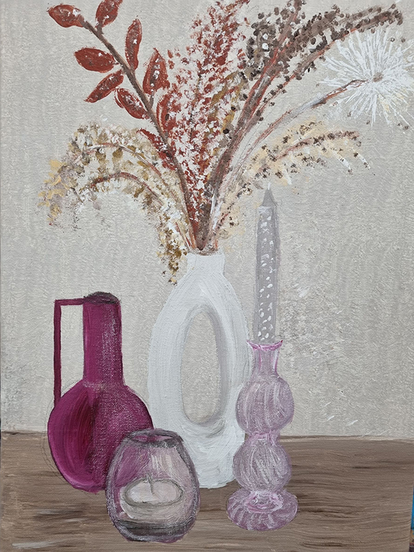 U ontdekt daardoor een bont aanbod aan prachtige schilderijen in verschillende stijlen en wordt misschien zelfs geïnspireerd om zelf de kwast op te pakken. De deelnemers vertellen graag meer over hun werk en hun ontwikkeling. De kleurrijke schilderijen zijn gemaakt met acrylverf op doek. In de lessen bij In de Hoge Hoed gaan de cursisten wekelijks aan de slag met een thema, zoals perspectief, abstract of portret. Schildercoach Fiona Hoogmoed inspireert en adviseert ze hierbij om tot een zo goed mogelijk resultaat te komen. Doordat elke deelnemer zo’n thema op zijn of haar eigen manier invult en uitwerkt, ontdekt elke cursist zijn eigen stijl van schilderen.