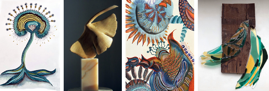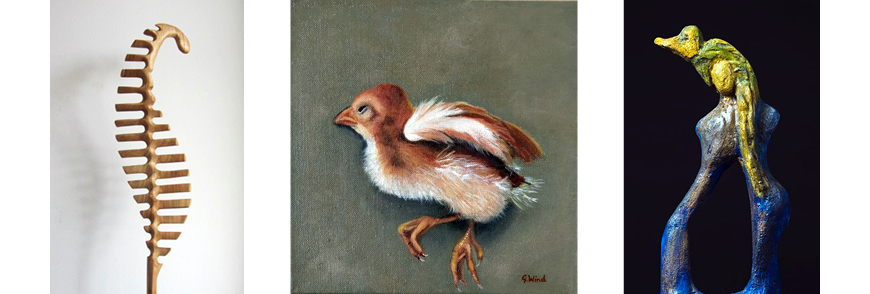 Aquarel/Mixed-media Carla van der Kooi; Houten beeld, Ginko – Coen Keer; Aquarel/Mixed-media Carla van der Kooi; Glasfusie, Vogel – Yvonne de Boer;