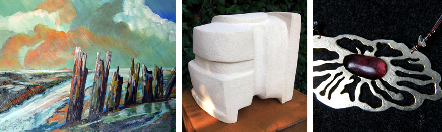 Schilderij, Stonehenge op het wad – Trijny Wilkes; Beeldhouwwerk – Gerarda Demarteau; Sieraden – Fieteke Leenes.