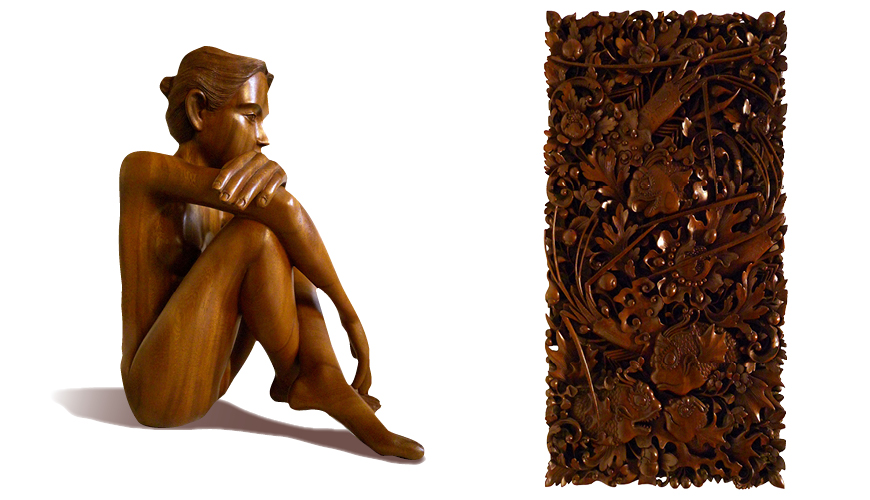 De geëxposeerde stenen en houten beelden zijn in Art Deco- of Art Nouveau-stijl. We zien bijvoorbeeld verstrengelde figuren of gedetailleerde houtreliëfs met dierfiguren; alles gestileerd en verfijnd in exotische houtsoorten.