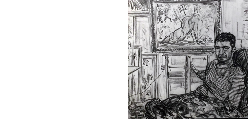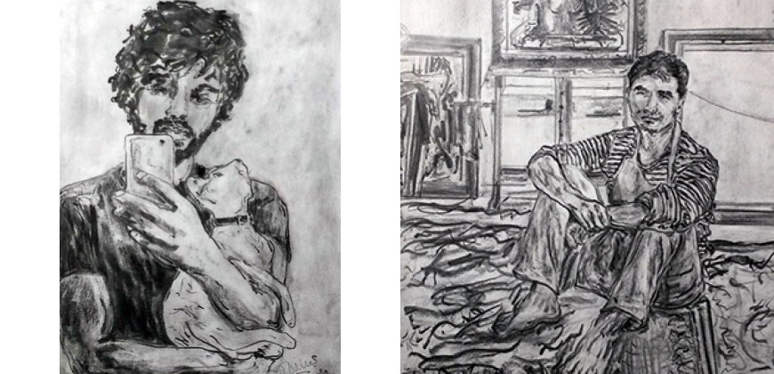 Dat is nu ook weer de benadering; met iets extra’s, nl. kunstenaars met hun huisdier. Het viel op dat de kunstenaars zichzelf met regelmaat fotografeerden met hun kat. Dit bleek een mooie aanleiding voor een extra thema. Carel kwam op het idee omdat hij in het contact met één van de kunstenaars een filmpje kreeg, waaruit bleek dat de kat met zijn poot van achter het doek probeerde de kunstenaar het werk onmogelijk te maken, of was het bedoeld als ‘assist’? Vervolgens gaf Carel een aantal modellen opdracht om foto’s te maken met hun huisdier. Inspiratiebronnen voor een hele nieuwe categorie tekeningen.