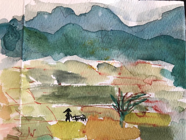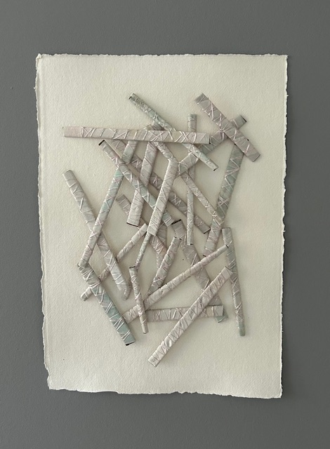 Anne Marijke maakt vouwboeken in mixed media techniek, vooral met textiel en papier. Om zich te oriënteren op wat ze wil maken tekent ze veel. Het gaat haar om lange, horizontale formaten, om de vergrijsde Nederlandse kleuren van het landschap, om rust en ruimte.