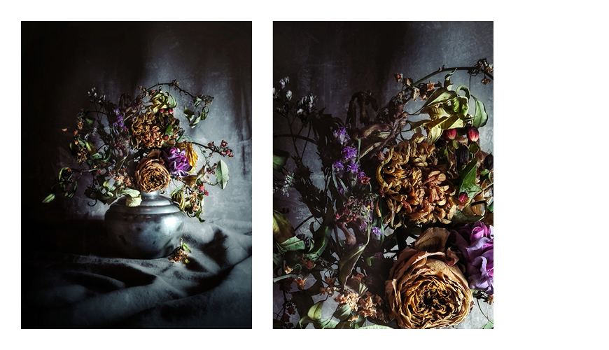 De uitgebloeide bos bloemen verhuist van de woonkamer naar haar werkplek. Daar mogen de bloemen in alle rust verder verdorren totdat ze op hun ‘mooist’ zijn. Marjolein fotografeerde ook voor deze serie alleen met haar mobiel en ook de nabewerking deed ze op haar telefoon. Het is de eerste keer dat ze met deze serie exposeert.