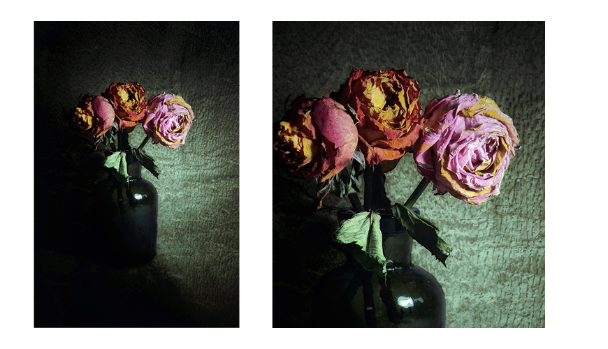 Op het moment dat een bos bloemen eigenlijk de groenbak in moet, wordt het voor Marjolein pas interessant. Ze raakte geïnspireerd door de bloemenschilderijen van Rachel Ruysch uit de 17e en 18e eeuw. Fotograferen is schilderen met licht, en zo gaat ze ook te werk.